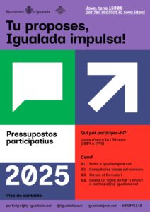 Consulta les bases de participació on trobaràs tota la informació que cal saber per poder participar del projecte Impuls 2025 i si et quedes amb dubtes, posa’t en contacte amb nosaltres participa@aj-igualada.net , 608 09 53 48 (whatsapp) o passa’ns a veure per La Kaserna demanant cita prèvia al Punt d’Informació Jove.