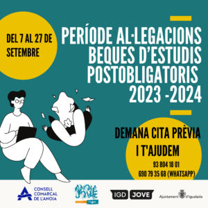 Ha sortit la convocatòria per demanar les beques a estudis post-obligatoris pel curs 2025/2026. Si sou d’Igualada, podeu demanar cita al 938041801 o enviar un whatsapp al 690793568. Els terminis són del 24 de març a les 8h fins el 14 de maig a les 15h. No ho deixis per l’últim moment!!