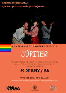 El proper 29 de juny a les 18h a l’Antic Escorxador tindrà lloc l’espectacle de teatre i dansa JÚPITER de la cia @homelandancecompany. Un espectacle emmarcat en l’agenda Impuls 2022 dels pressupostos participatius joves que ens convida a revisar-nos i a dirigir una mirada crítica cap a com ens relacionem dins i fora de la comunitat LGTBIQ+.